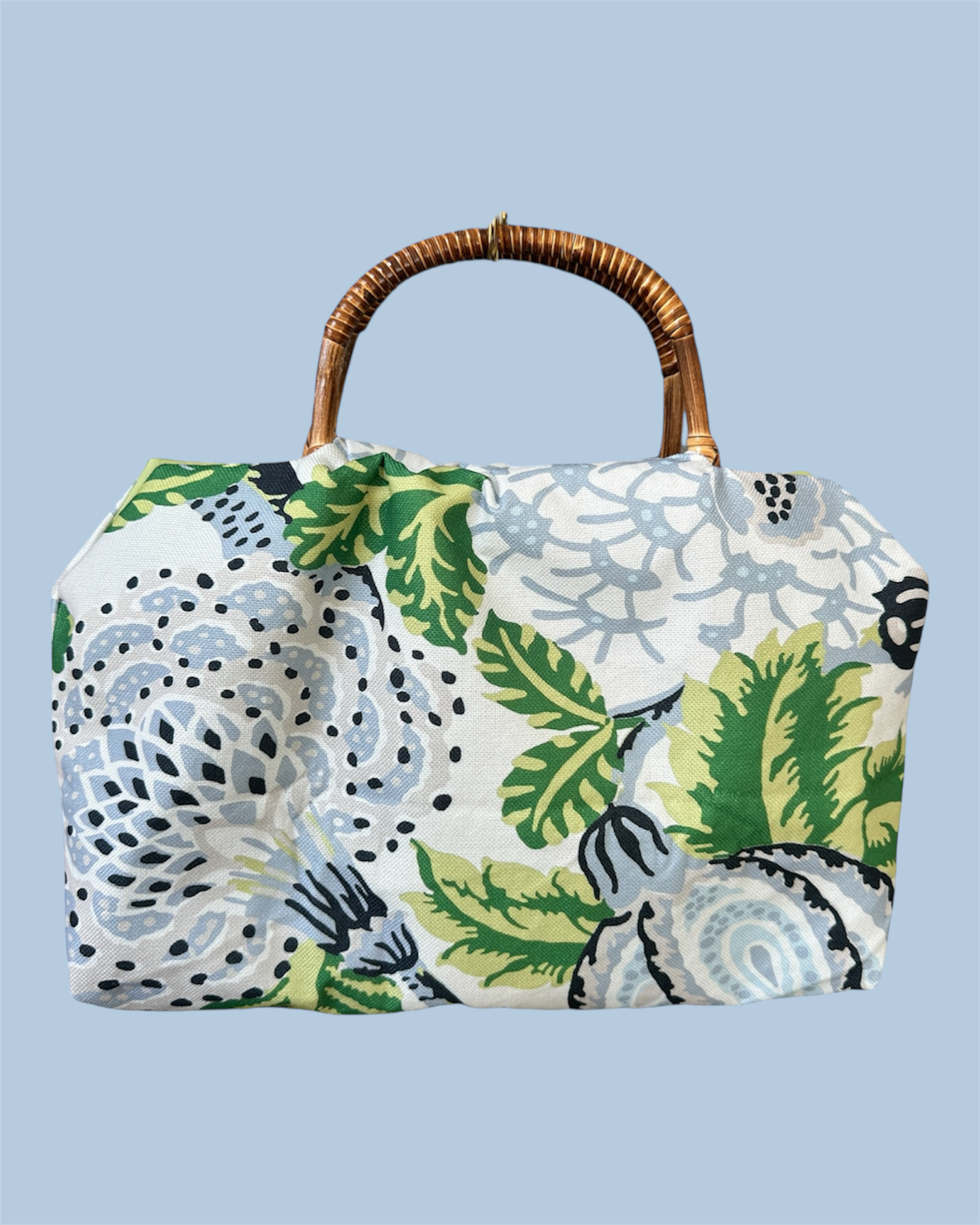 Delicately crafted with pale floral accents in soft blues and gentle greens, The Silver Moss exudes understated elegance. Perfectly sized for travel yet effortlessly chic for high-season outings, it’s ideal for brunching with friends or strolling along your favorite village streets. A versatile companion, it blends luxury with practicality, making every journey — near or far — an occasion to carry beauty with you.